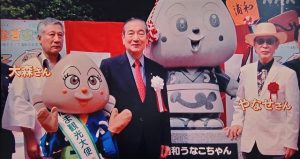 浦和駅西口前の「うなこちゃん」像からスタートし、作者のやなせたかしさんと懇意にしていた県庁通り沿いのうなぎ屋の大森さん店で「うな重」の昼食、前市長と納まった写真あり。