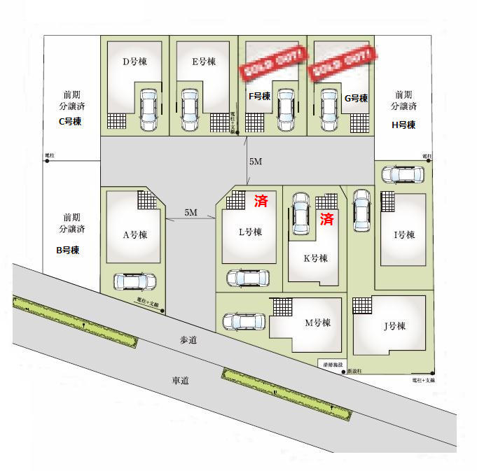 | 特色 | 駐車場、公共本下水、都市ガス 全10棟 諸条件はA号棟 F・G・K・M号棟終了 価格:4980万円〜5680万円 | |||||||||||||||||